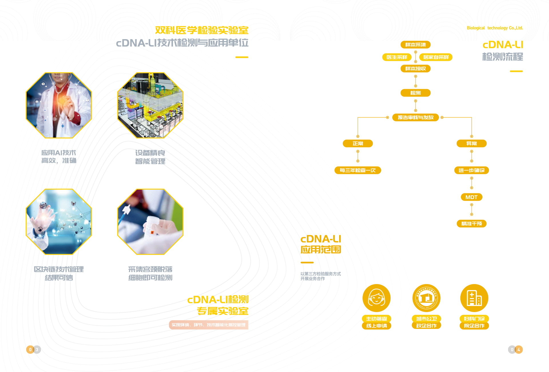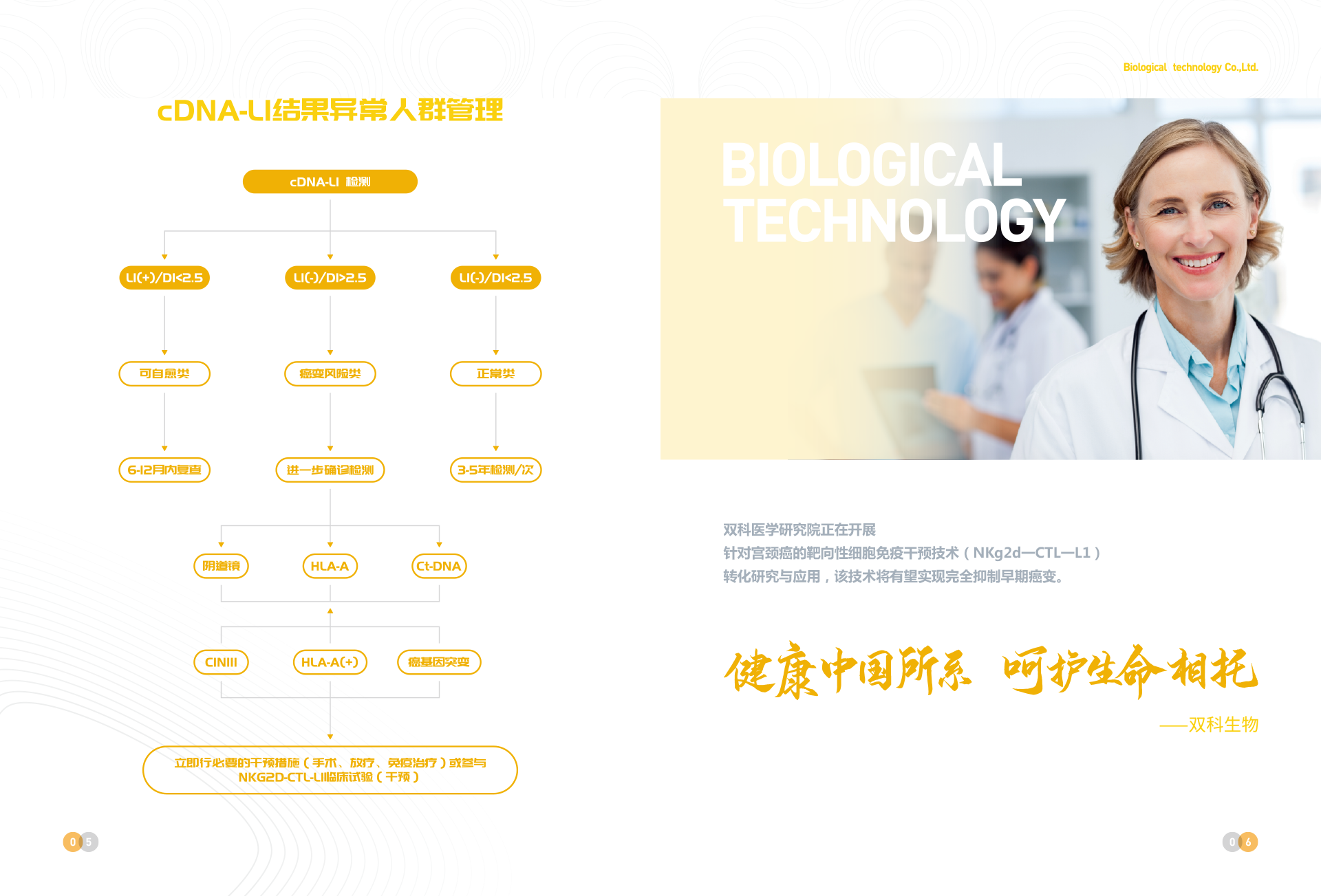 深圳市雙科生物科技有限公司創立于2012年12月12日,是按照國家“十二五”、“十三五”科技創新規劃、《中國防治慢性病中長期規劃(2017-2025年)》與《“健康中國2030”規劃綱要》等政策要求,以“健康中國所系,呵護生命相托”為公司使命,在“十二五”及“十三五”期間公司先后完成技術體系建模與試運行、服務體系構建與運行、腫瘤綜合防控體系建立與實施,在高新生物技術領域,形成了具有完全自主創新與獨立知識產權的常見腫瘤液態活檢技術、體細胞技術、醫學AI技術、宮頸癌預警cDNA-L1技術、腦卒中早期預警MTHFR/MTRR技術 、 N-MDT技術、“防-控`-保”技術等和服務體系。